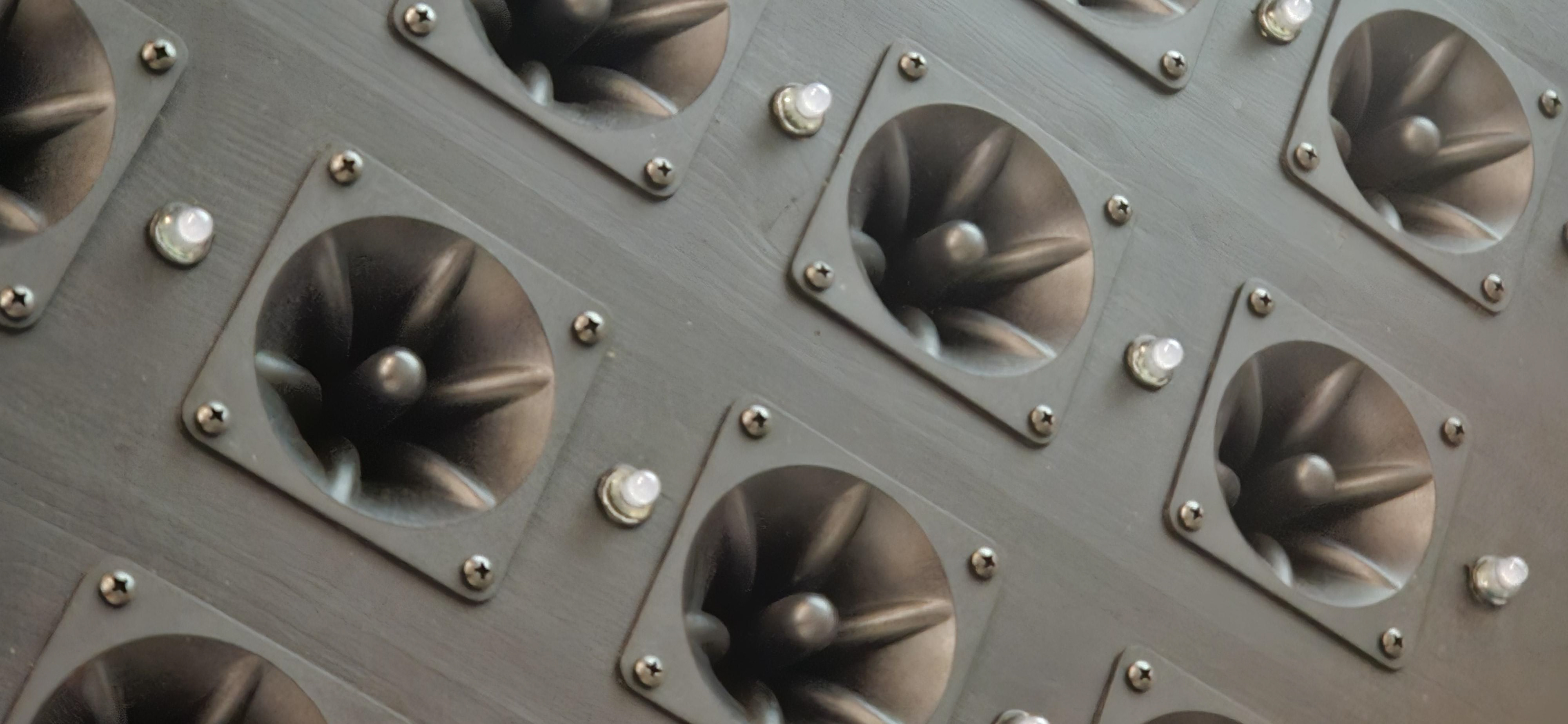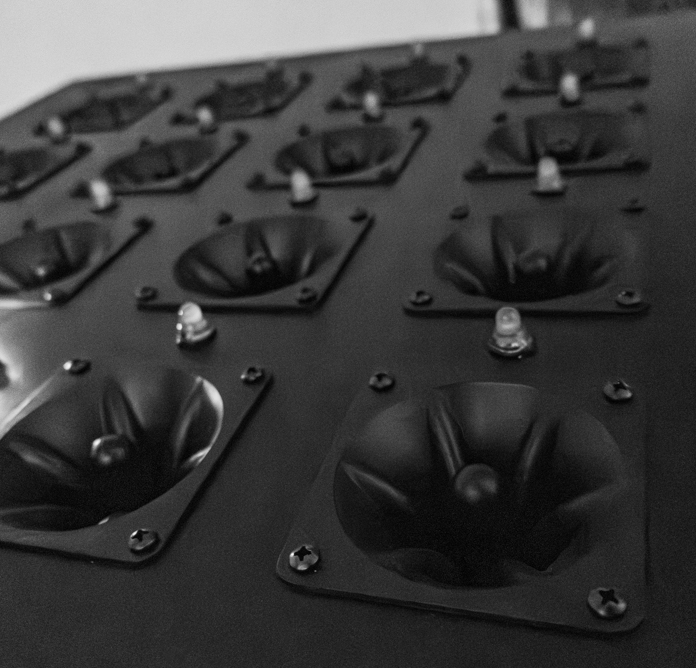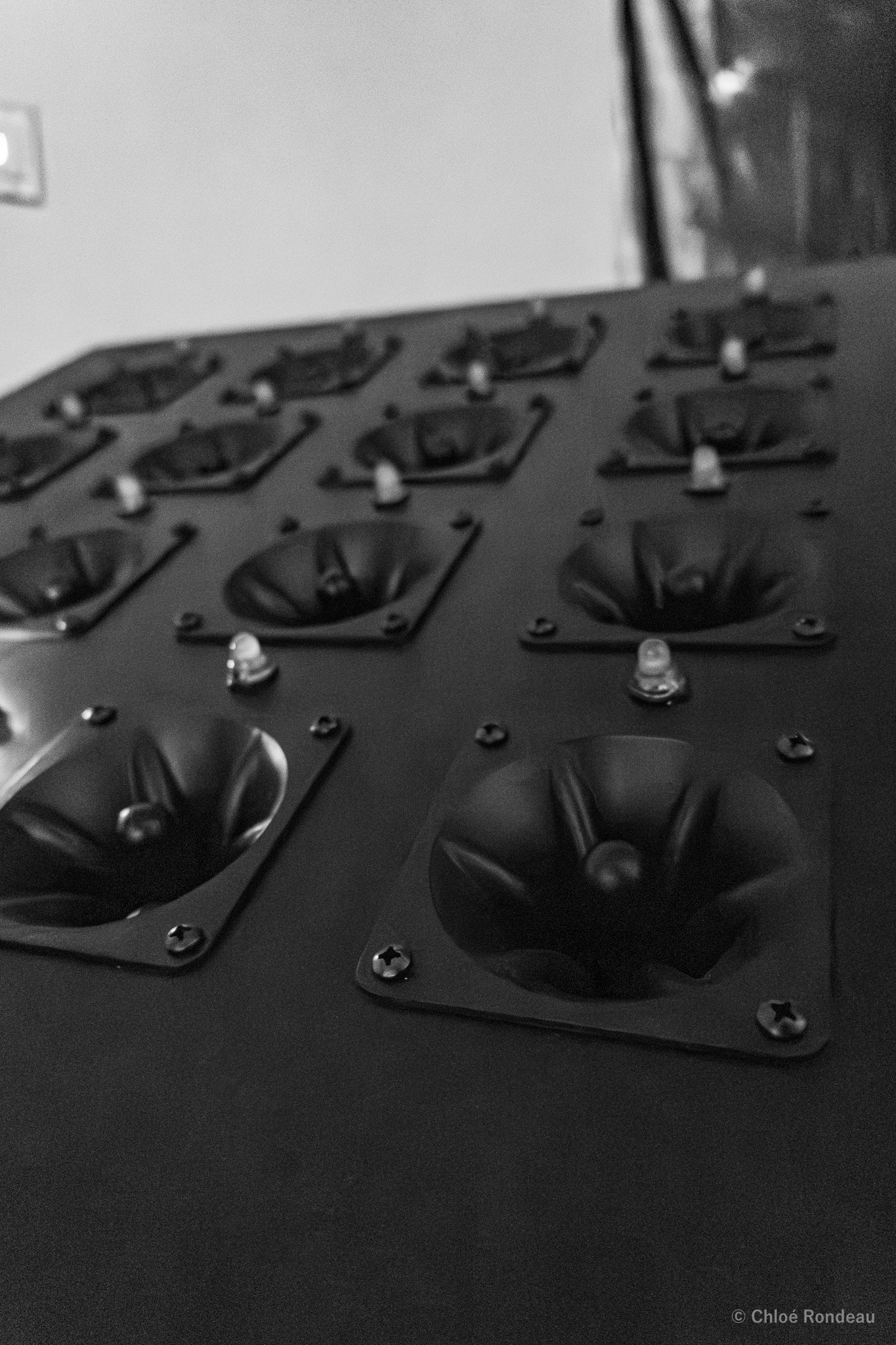 To underline the emerging rhythmic structures, a lighting device accompanies the sound: a light is placed above each loudspeaker, activating in synchrony with the song it emits. When the installation is plunged into darkness, it becomes a living score in which sound and light intertwine, making the interweaving of rhythms as visible as they are audible.